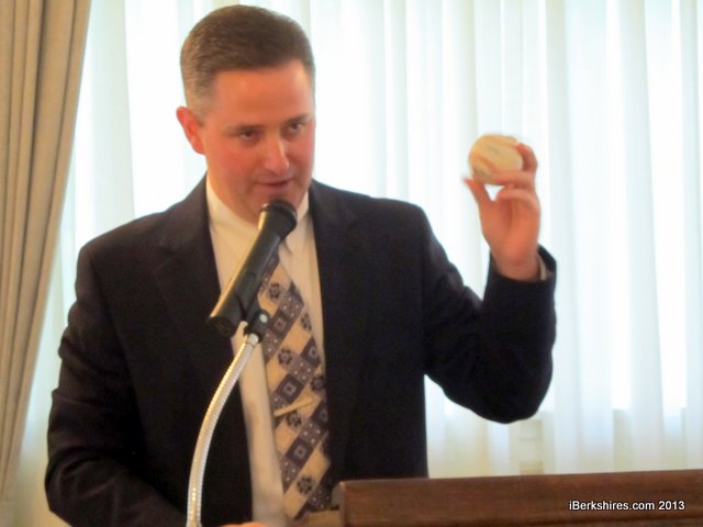 "This ball isn't just a ball," he said, pulling it out of his pocket. "This is a symbol of perseverance, it's a goal of not giving up. ... Five years ago, we had a ball hit to us, the Northern Berkshire United Way. ... We didn't give up on that ball. We've been under the seats for the past five years trying to grab it."