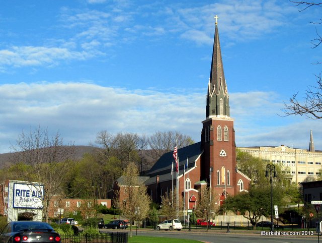 St. Francis' Church, built in 1863, commands the corner at Union and Eagle streets. At left is Rite Aid; a CVS Pharmacy has proposed demolishing the church to put in a new building and drive-through. To the right behind Conte School is the steeple of Notre Dame, owned by the city. That section around Church, East Main, Union and Willow Dell is one of the oldest intact sections of the city.