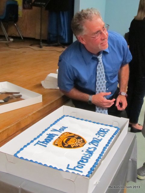 "I was stunned," said Holmes as a cake decorated with the North Adams Police Department shield was sliced up for the party at Sullivan. "I saw some of the other teachers and wondered why they were here, then I saw my parents."