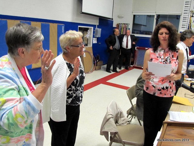 Above, Town Clerk Carol Jammalo swears in Rose M. Peters, left, for library trustee and Patricia A. Prenguber for School Committee after town meeting. |