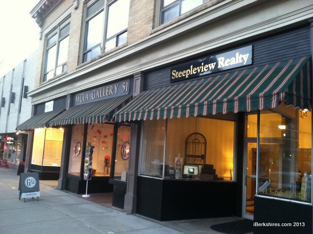 Wedged between local staples The Hub and Gallery 51, alongside Press gallery and Berkshire Emporium & Antiques, the new storefront replaces Gallery 53, the "pop-up" gallery sponsored by Massachusetts College of Liberal Art's DownStreet Art. Pip Printing had been the previous occupant. Steepleview formerly occupied a space in the concourse at nearby 85 Main, where its office had a distinctly different atmosphere.