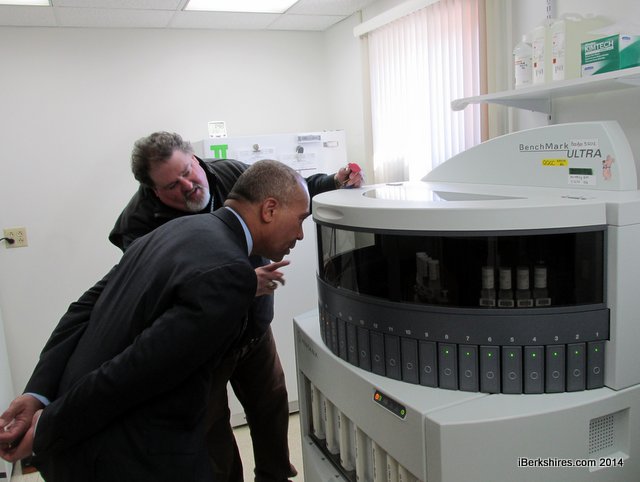CEO Pat Muraca shows Gov. Deval Patrick the steps the companies goes through in testing new biomarkers.