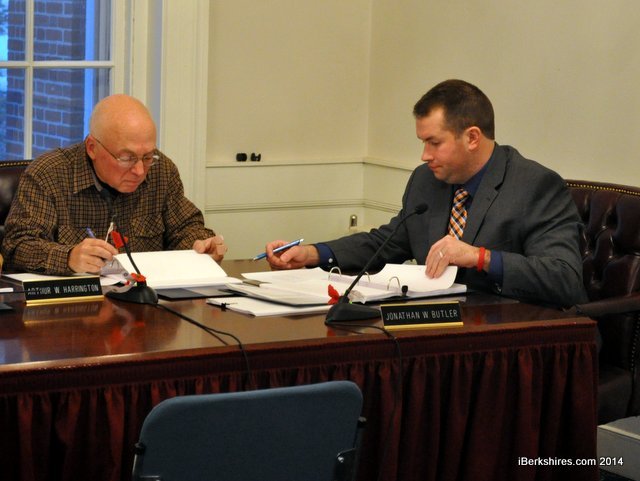 Town Administrator Jonathan Butler, right, and Selectman Arthur 'Skip' Harrington review budget items on Wednesday. |