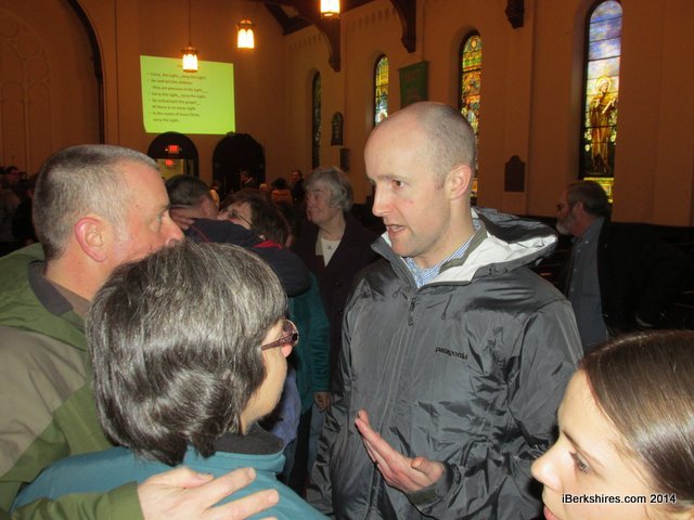 State Sen. Benjamin Downing speaks with Police Director Michael Cozzaglio at Sunday's prayer service. Downing said efforts continue to get BMC licensed to operate the NARH emergency room. |