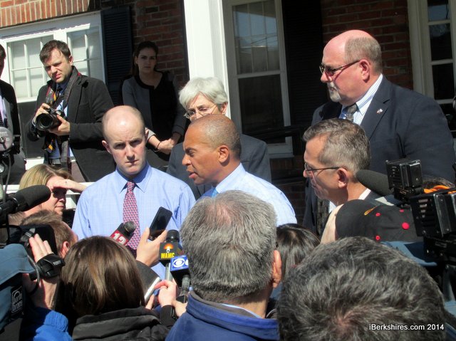 Patrick spent Tuesday morning working at Massachusetts College of Liberal Arts with Department of Public Health Secretary John Polanowicz, Mayor Richard Alcombright, state Sen. Benjamin Downing, state Rep. Gailanne Cariddi and Berkshire Health System officials to file an application for reopening as an emergency satellite facility.