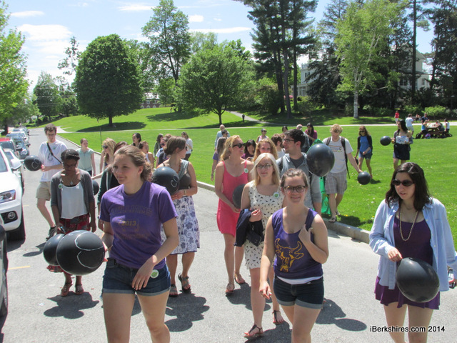 The group met on the steps of the Paresky Center and blew up black balloons symbolizing the carbon dioxide emitted by members of the college community. They then marched to the administration building while three members of the group presented Falk with a petition calling for stronger carbon reduction goals at the college.