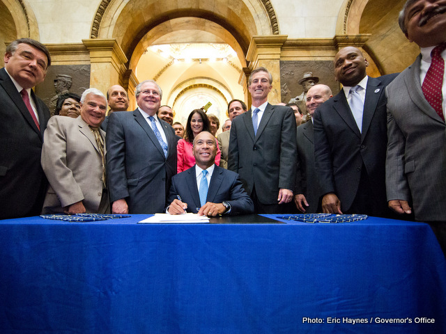 Gov. Deval Patrick signs into the law the nation's highest minimum wage. |