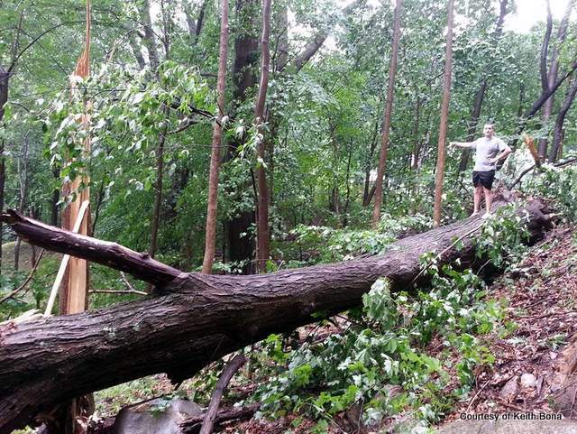 The storm was accompanied by some flooding and downed wires and trees around the county, but perhaps the most dramatic effect was a path cut through Keith Bona's yard.