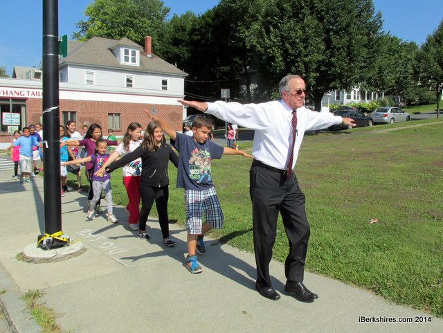 Mayor Daniel Bianchi leads a ground of children to a smooth landing at walking loop ceremony.