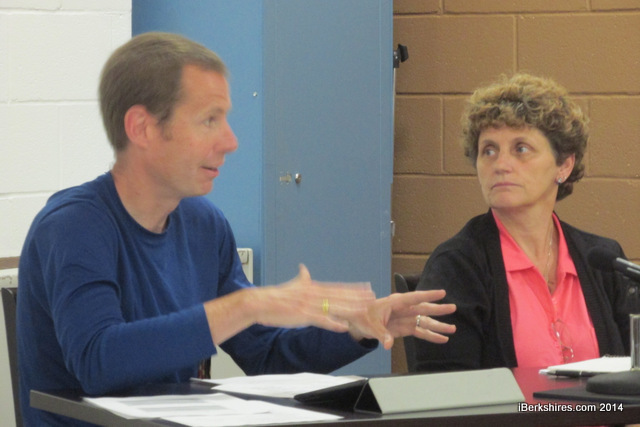 Williamstown School Committee member Dan Caplinger makes a point as Lanesborough School Committee Chairwoman Regina DiLego looks on. |