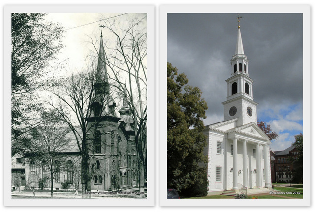 Initially, the church held services in a log meetinghouse built on the town square, what is now Field Park. A second meetinghouse built there burned to the ground in 1866.