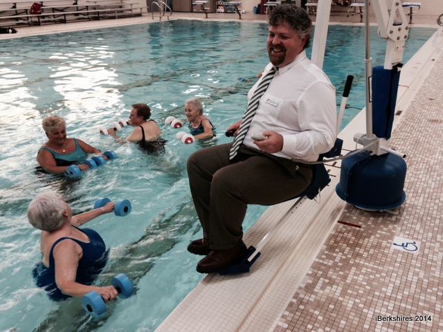 Joined by North Adams Mayor Richard Alcombright and state Sen. Benjamin Downing, YMCA CEO Justin Ihne unveiled a newly renovated ADA-compliant family locker room and pool lift chair that makes it easier for those with physical limitations to access the water.