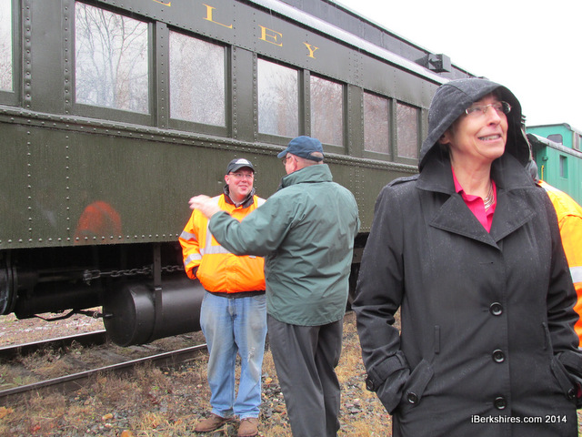 Jay Green, left, of Berkshire Scenic Railway, Mayor Richard Alcombright and state Rep. Gailanne Cariddi tour three cars that arrived Sunday night. See photos and videos of the cars'  roundabout trip from their home base in Lenox here.