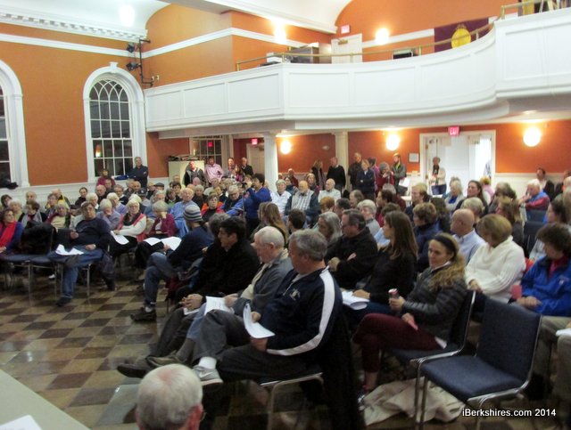 The meeting was so well attended that residents were standing in the back and the meeting was delayed 15 minutes while voters piled into Town Hall. |