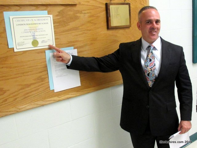 Secretary of Education Matt Malone points to Lanesborough's certificate during a recent visit. |