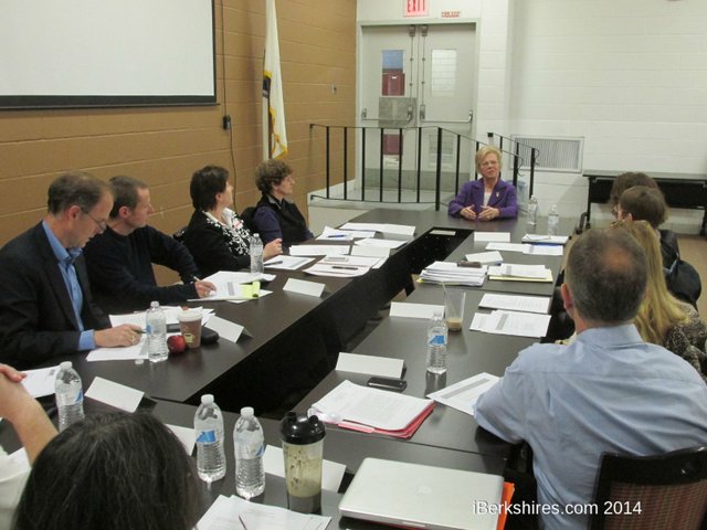 School committee members from Lanesborough and Williamstown interview Stockbridge's Donna Moyer. |