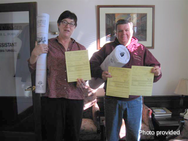 Debra Turnbull, assistant to the town manager, and Allen Caldwell, project superintendent for NEI General Contracting hold the final building permits issued Friday for Cable Mills.