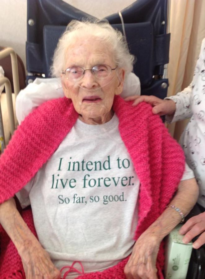 Despite being born in horse-and-carriage days, Madigan had a presence on Facebook and Twitter (with help from her Daniels relatives). One of her recent Facebook posts features her in a T-shirt that says "I intend to live forever — So far, so good."