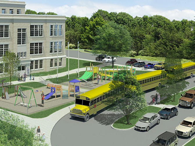 The school's main entrance on East Main Street will have two vehicular traffic loops — one closest to the school for the four to five buses and a second with spots for up to 20 cars.