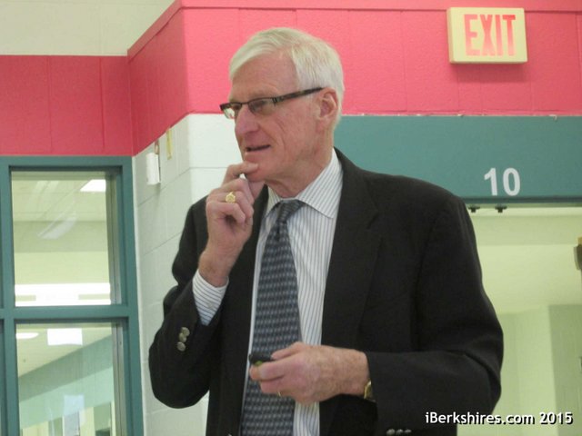 Interim Superintendent Gordon Noseworthy talks budget numbers at a public hearing of the Mount Greylock Regional School District fiscal 2016 spending plan in Lanesborough. |
