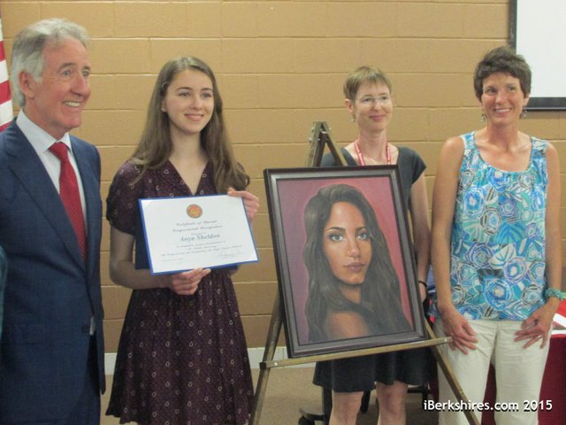 Mount Greylock junior Anya Sheldon is recognized by U.S. Rep. Richard A. Neal for her artwork that will hang at the U.S. Capitol.