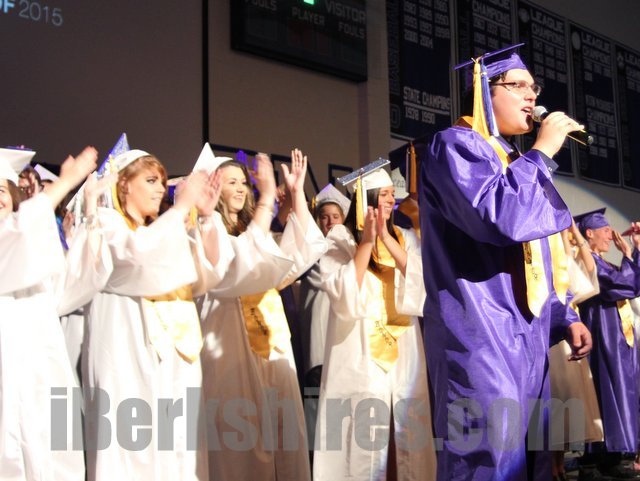 The Drury High School class of 2015 rocks 'We're Takin' Off' at graduation on Thursday. Left, Nicholas Trombley leaves them with simple advice to 'be happy.' See more photos here. |