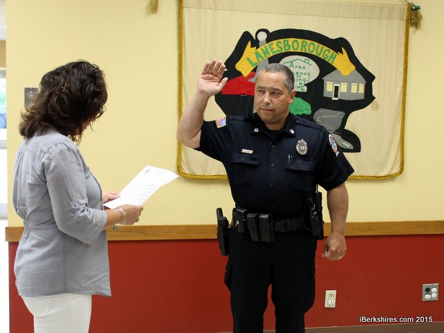 The Connecticut state police trooper, along with Timothy Sorrell's longtime friend Pittsfield Sgt. Glen Decker, pinned the Lanesborough police chief badge on Timothy Sorrell.
