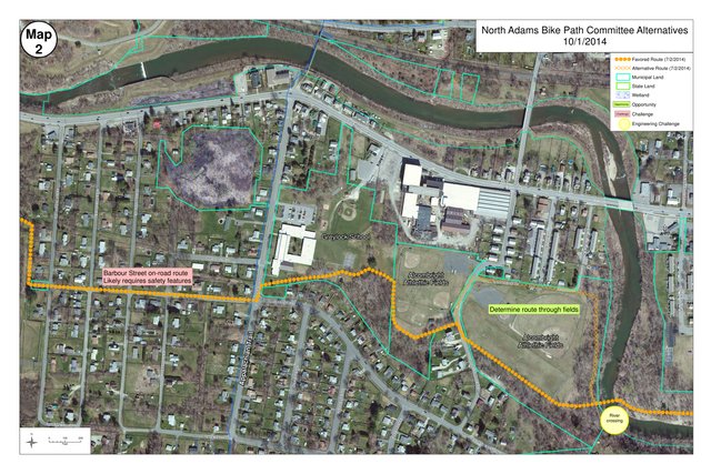 The city is trying to pull together a route that will link the downtown to the planned Williamstown bike path running from Cole Field to the Spruces. The goal is eventually to hook up to the Ashuwillticook Rail Trail on the Adams end.