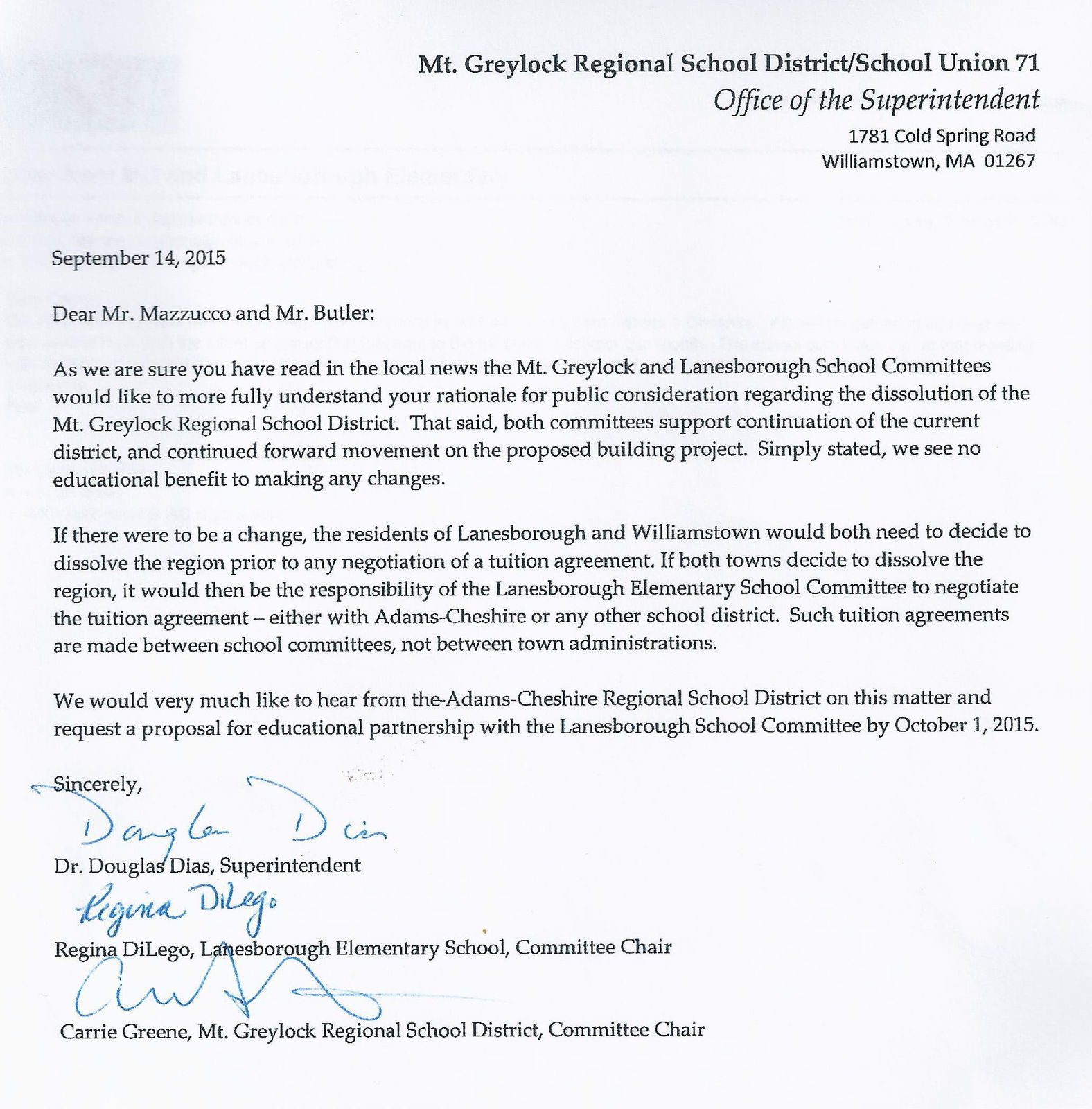 The Sept. 14 letter affirmed the district's and school committees' support for continuing the Mount Greylock district and said, "we see no educational benefit to making any changes."