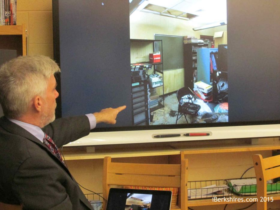 Superintendent Douglas Dias shows photos of the damage caused by a leak in the school's heating system.