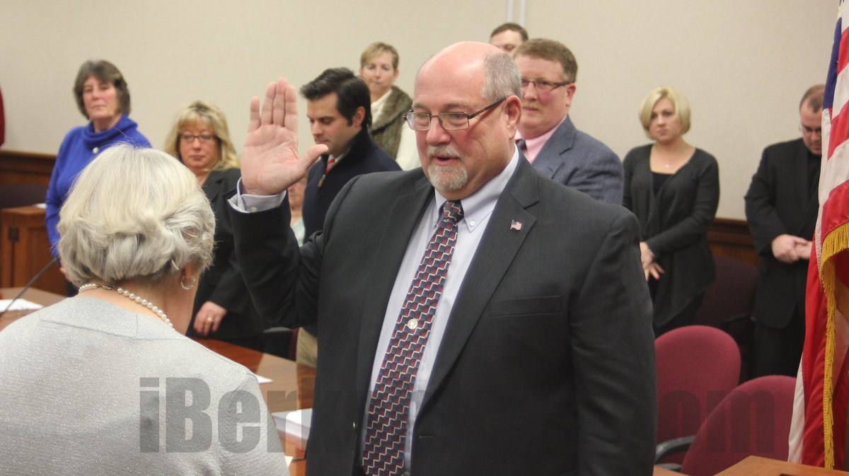 Mayor Richard Alcombright is sworn in for a fourth term on Friday by City Clerk Marilyn Gomeau.