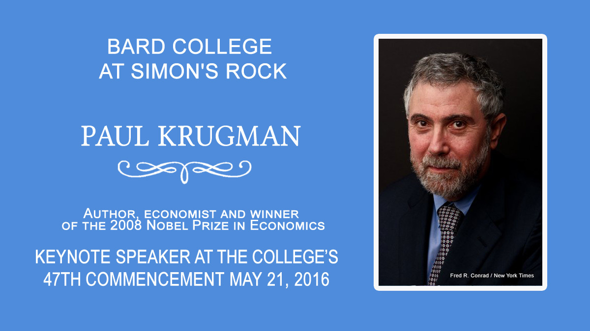 "We at Simon's Rock are honored to have a speaker of Dr. Krugman's brilliance and integrity deliver the 2016 keynote address," said Ian Bickford, provost and vice president of Bard College at Simon's Rock. "He will be an inspiration to our graduates, a powerful group of independent thinkers in their own right."