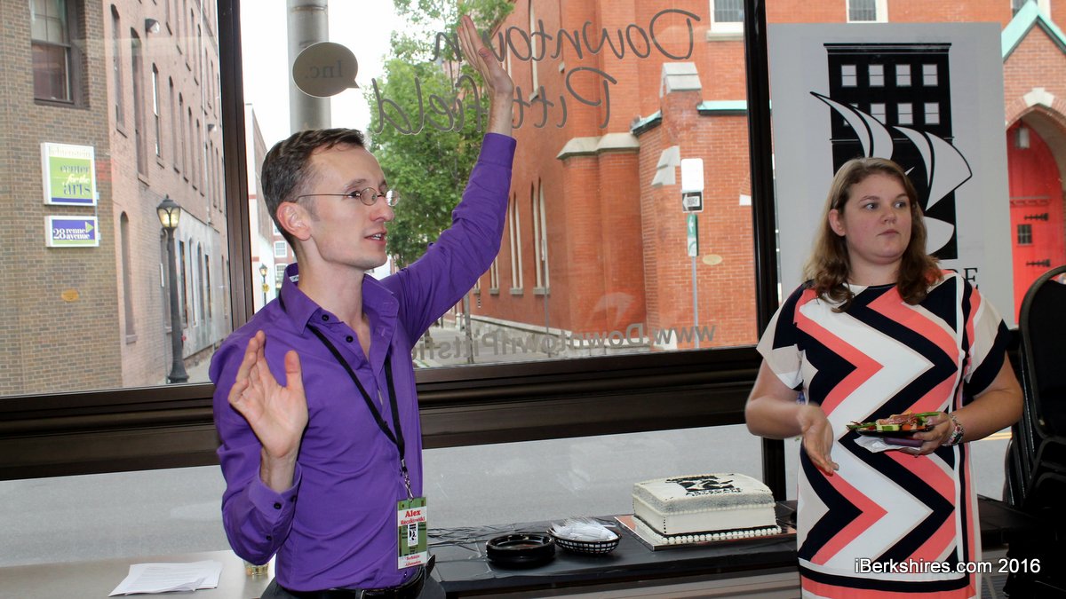 The artists gathered in the Downtown Pittsfield Inc. offices before the First Friday Artswalk on Friday to unveil the winning designs.