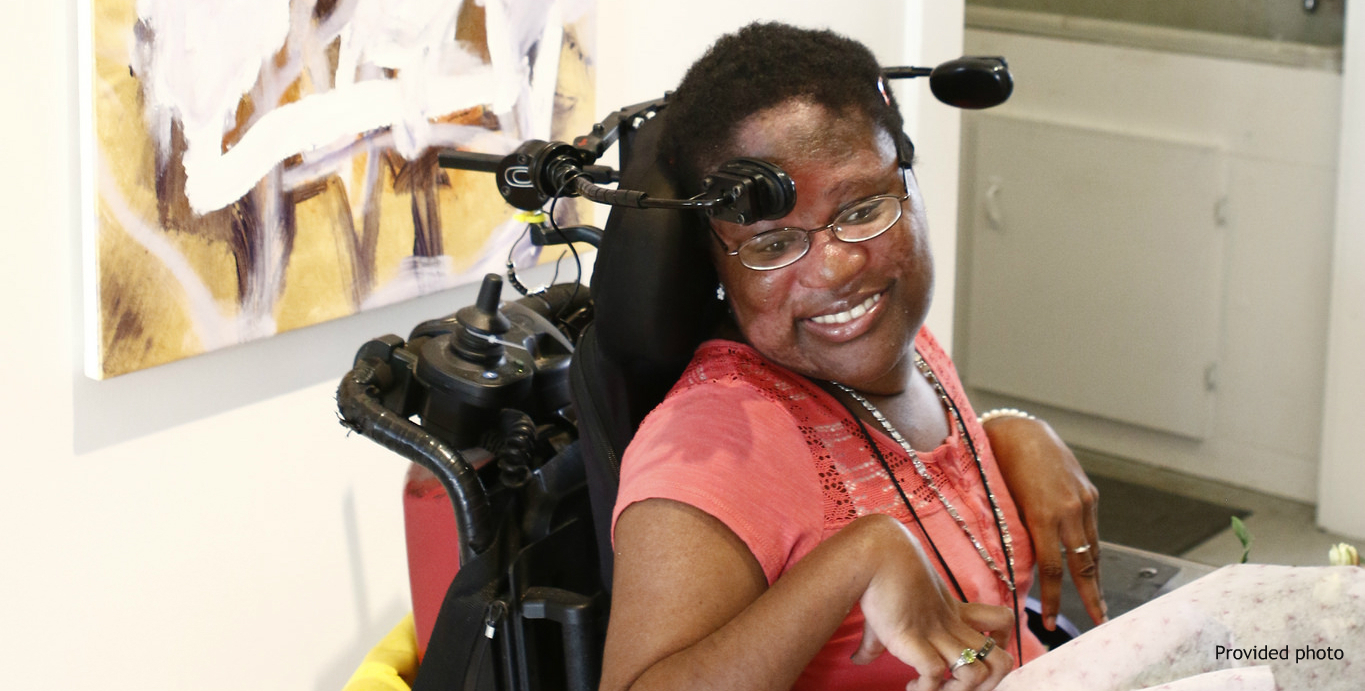 CATA artist Katrina Couture with one of her paintings. For 10 years, Couture has been painting using the Artistic Realization Technologies technique for individuals with significant physical disabilities. Couture's paintings are included in the exhibit this summer at the Clark.