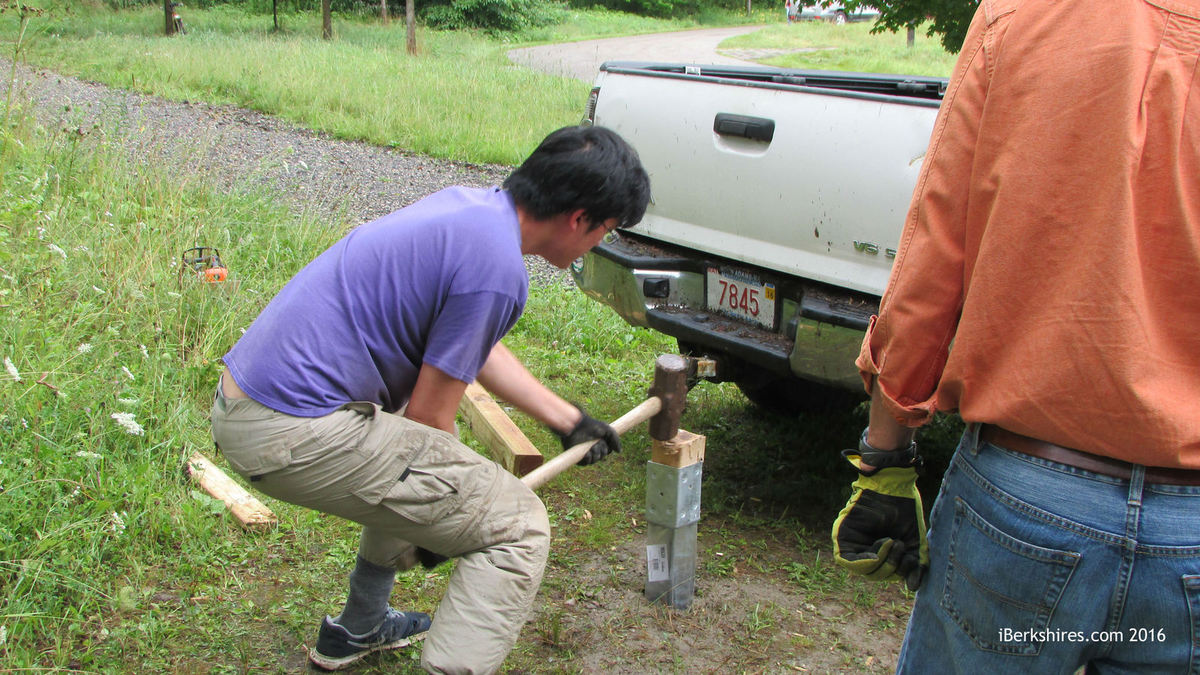 Scott Lewis from the Williams College Outing Club, three Williams students, members of the town's Conservation Commission and Dustin Griffin from the Williamstown Rural Lands Foundation were among those installing 4-by-4 posts at key locations and hanging color-coded metal markers on posts and trees to direct hikers through a network of trails.