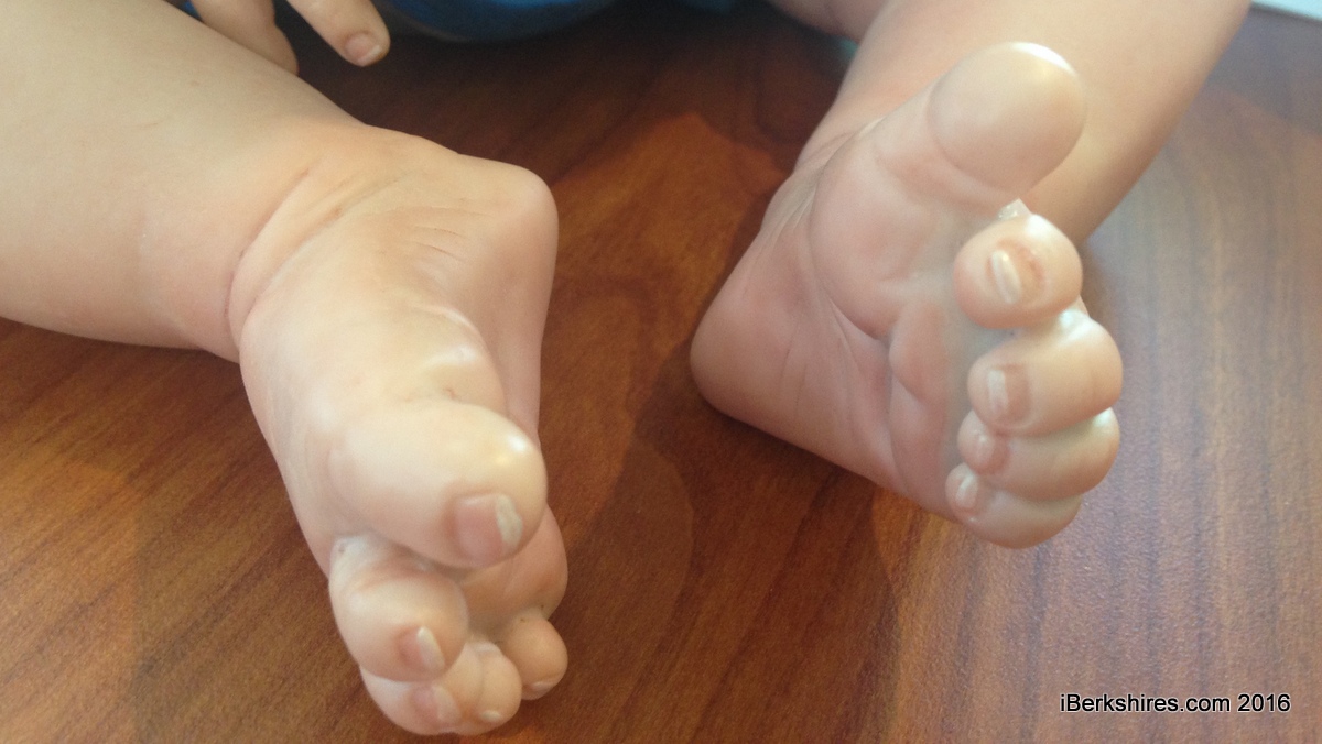 The tiny feet of Angie, one of the dolls adopted by Williamstown Commons, show the realistic details like toenails that make them so lifelike.