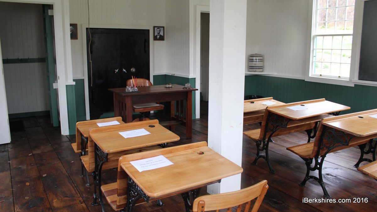 The schoolhouse is close to what it must have looked like in the 1940s, with electrical lighting but no heat. The chimney had to be taken down to move the building for foundation work.
