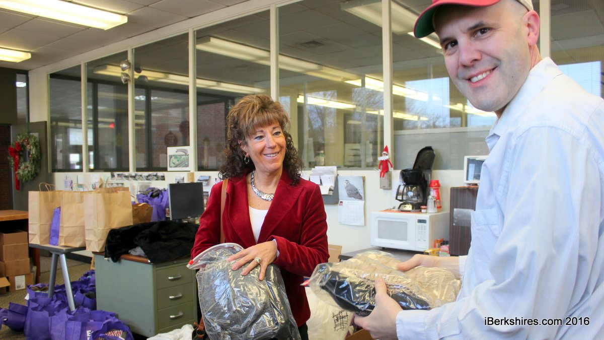 Office assistant Tina Samson has set up an area in City Hall for veterans to gather what they need. Coats donated by the Salvation Army are separated by size and the child-size coats donated to Berkshire Community Action Council. With the help of participants in the Community Service Program, the donations from the Trial Court were also set out by category.