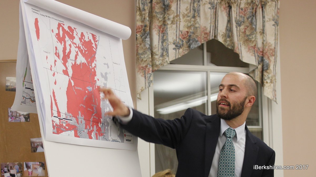 Jay LaTorre, a radio frequency engineer for Verizon, explains the 'alpha coverage,' seen in red, of the North Adams tower.Residents questioned the need for another tower that would not comply with the town's five-mile limit between facilities.