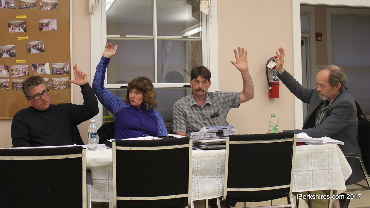Planners Eric Booth, left, Audry Matys, Gary Pierce and Carl McKinney, stepping in as interim until the town election, vote to reject a special permit to allow Verizon to site a cell tower on Route 8.