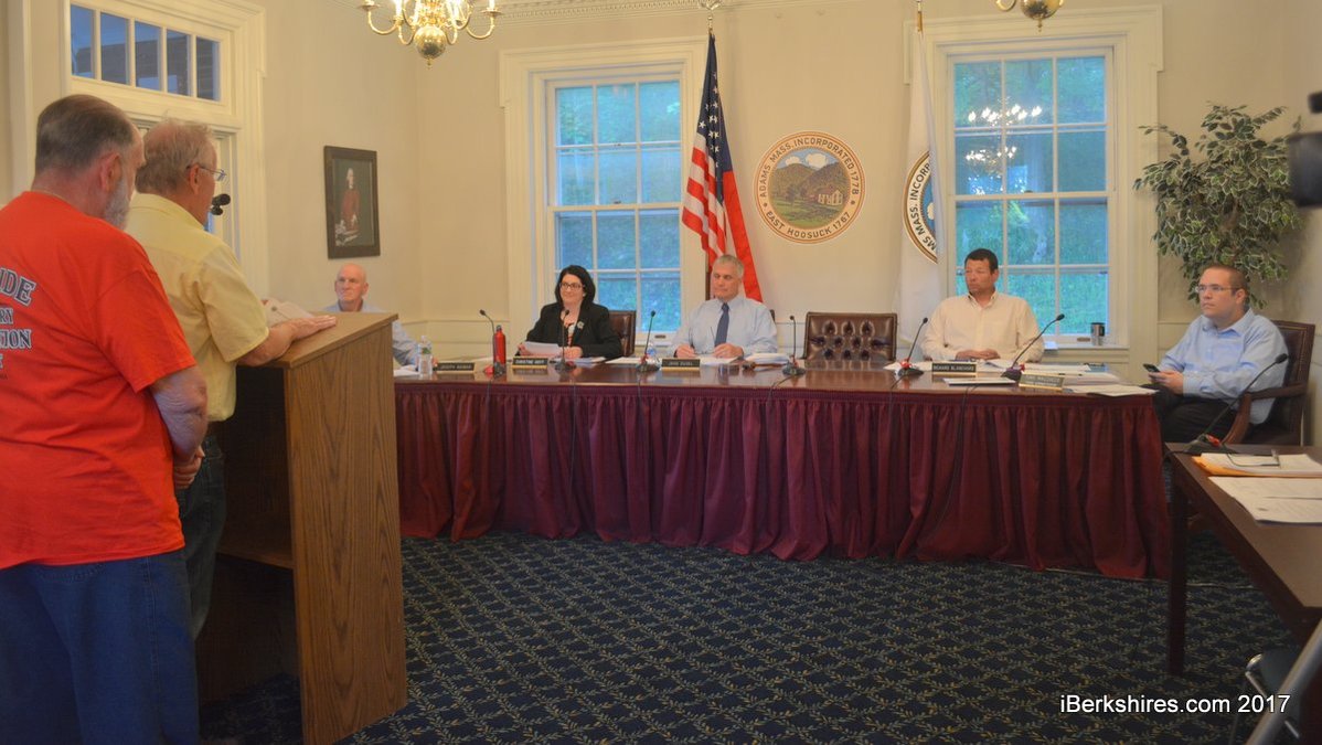 Cemetery Commissioner Bruce Shepley and Roger Eurbin, left, who leads a North Adams cemetery restoration group, speak to the board about restoring Maple Street Cemetery.