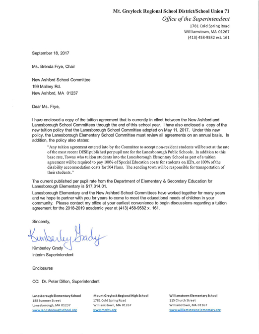 New Ashford officially was notified by the district in September of a spring vote by the Lanesborough School Committee to institute a policy aligning tuition rates with the per pupil cost of a school's education as calculated by the Department of Elementary and Secondary Education.