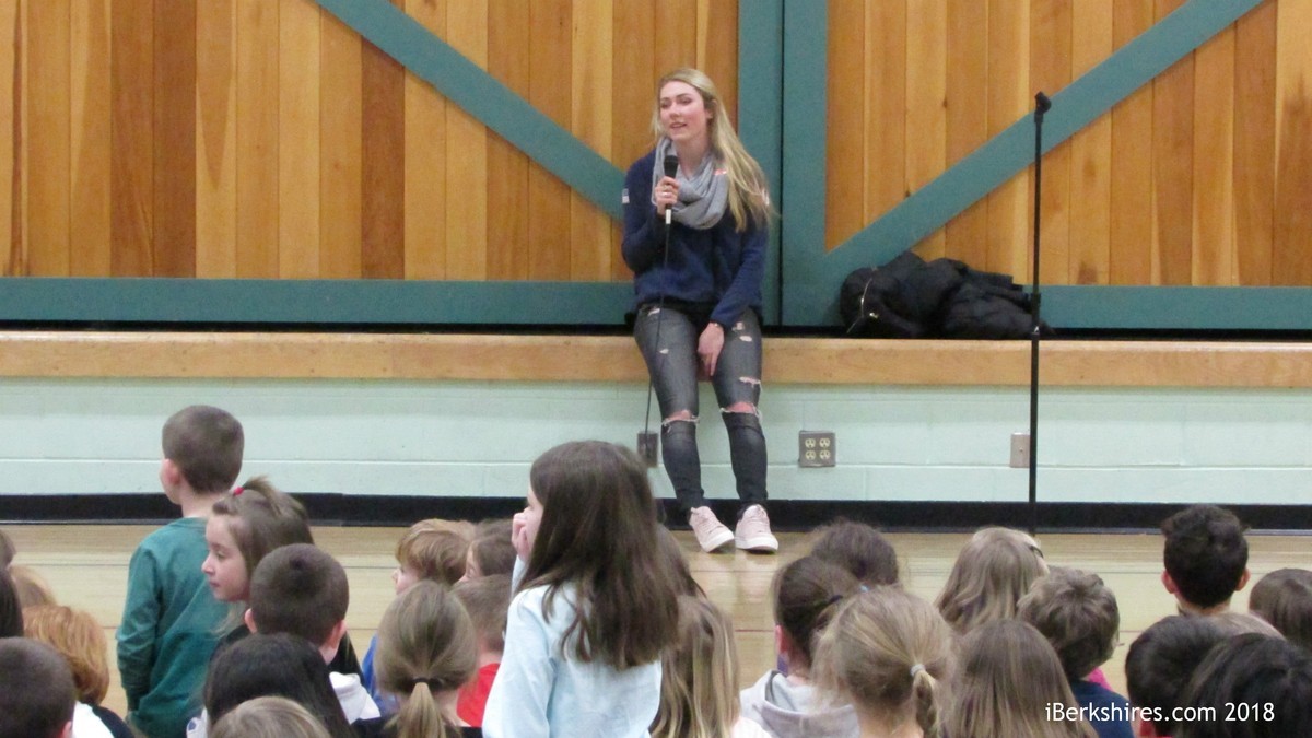 Olympic gold-medalist Mikaela Shiffrin talks with Lanesborough Elementary School pupils on Monday.