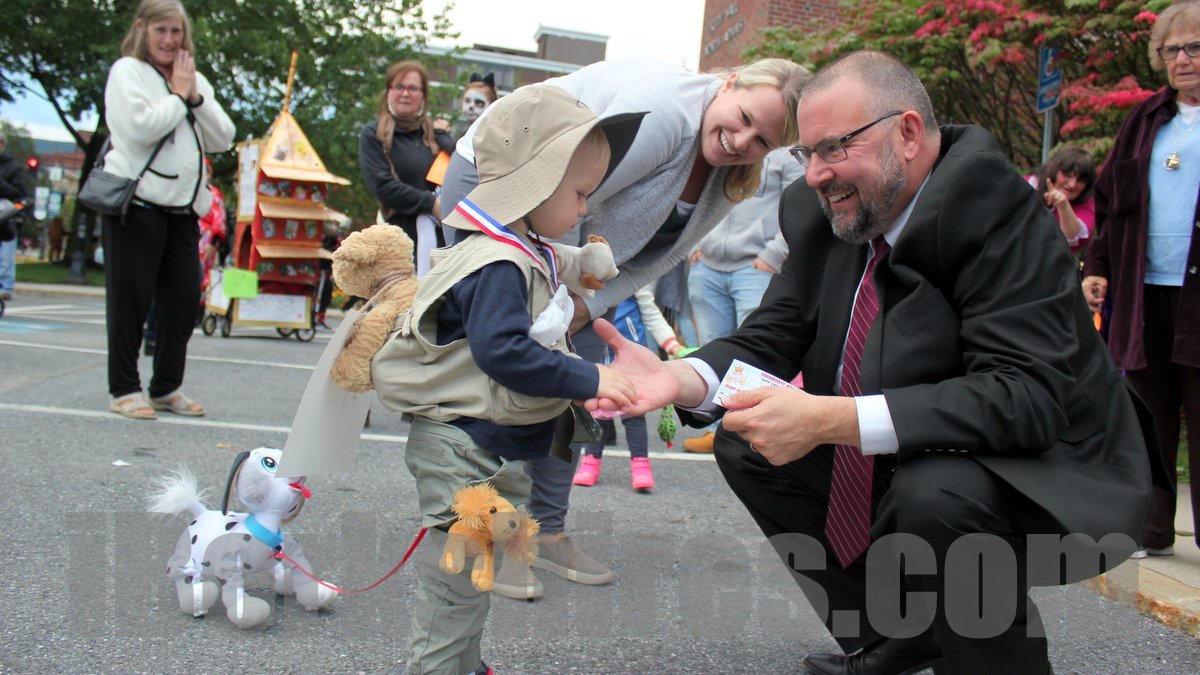 Benjamin Wiessner is congratulated by Mayor Thomas Bernard after winning first place in the individual costume category. See more photos from the parade here.