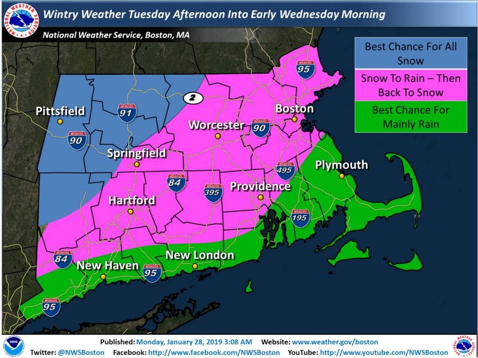 The National Weather Service on Monday morning issued a winter storm watch from 1 p.m. Tuesday to 7 a.m. Wednesday for the greater region. Snow should start Tuesday afternoon, become steady by Tuesday evening, get heavier overnight and end by daybreak Wednesday.