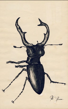 Ink sketch of a stag beetle by Tor Hansen. Below, an actual North American stag beetle.