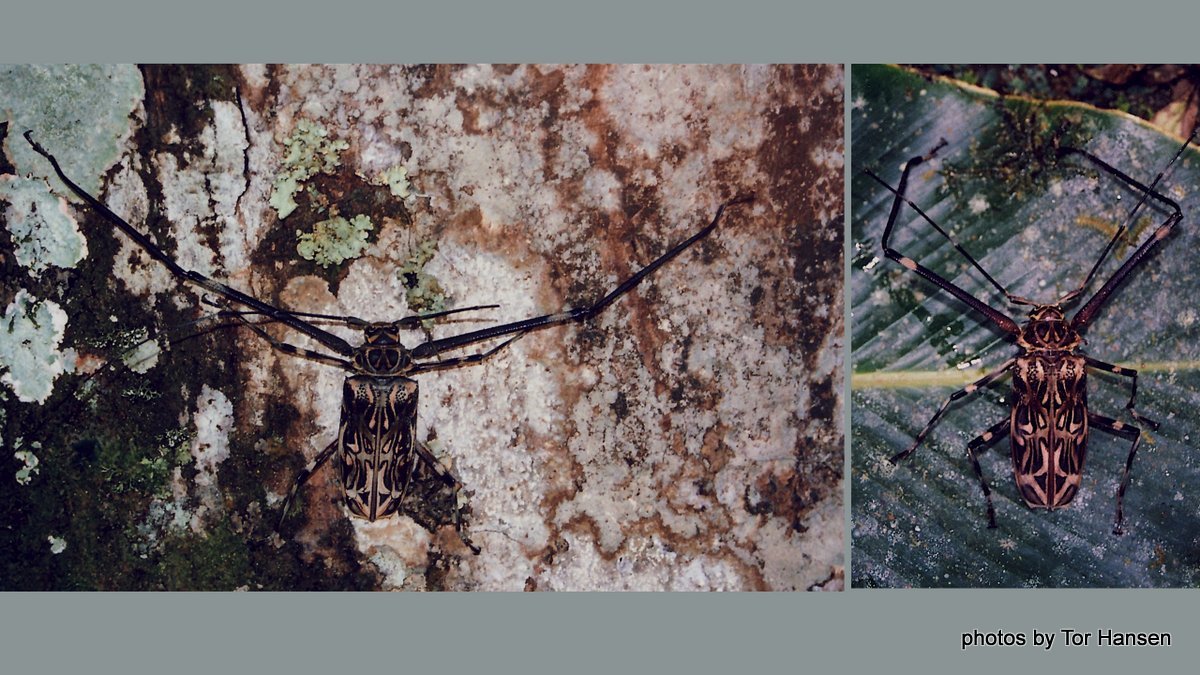 Of all the bizarre exotic beetles seen in my travels thus far, one with extremely long forelegs is nothing short of astonishing. The harlequin beetle, Acrocinus longimanus, is at first imposing, it delivers a stout bite if not handled gingerly, and to add to its fright posture it sports very long antennae. How relieved was I when I noticed its still form clinging like a decoration to a lichen-clad tree outside the cabanas at Tinalandia, Ecuador, right in rainforest habitat at that.