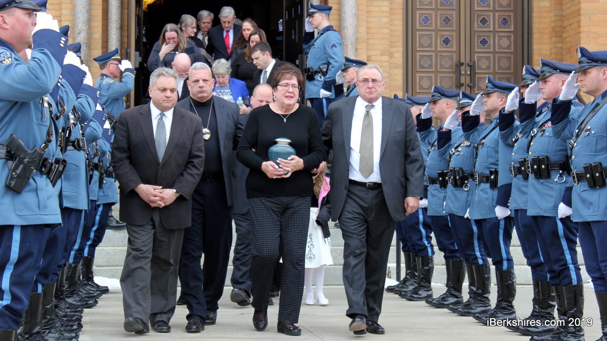 Dozens of state police vehicles with lights flashing, local police cruisers, ambulances and fire trucks lined Hoosac Street for his funeral on Saturday for four hours. At least 100 state troopers and other emergency personnel attended calling hours at Paciorek Funeral Home and then marched to St. Stanislaus Kostka Church, led by State Police Col. Kerry Gilpin.