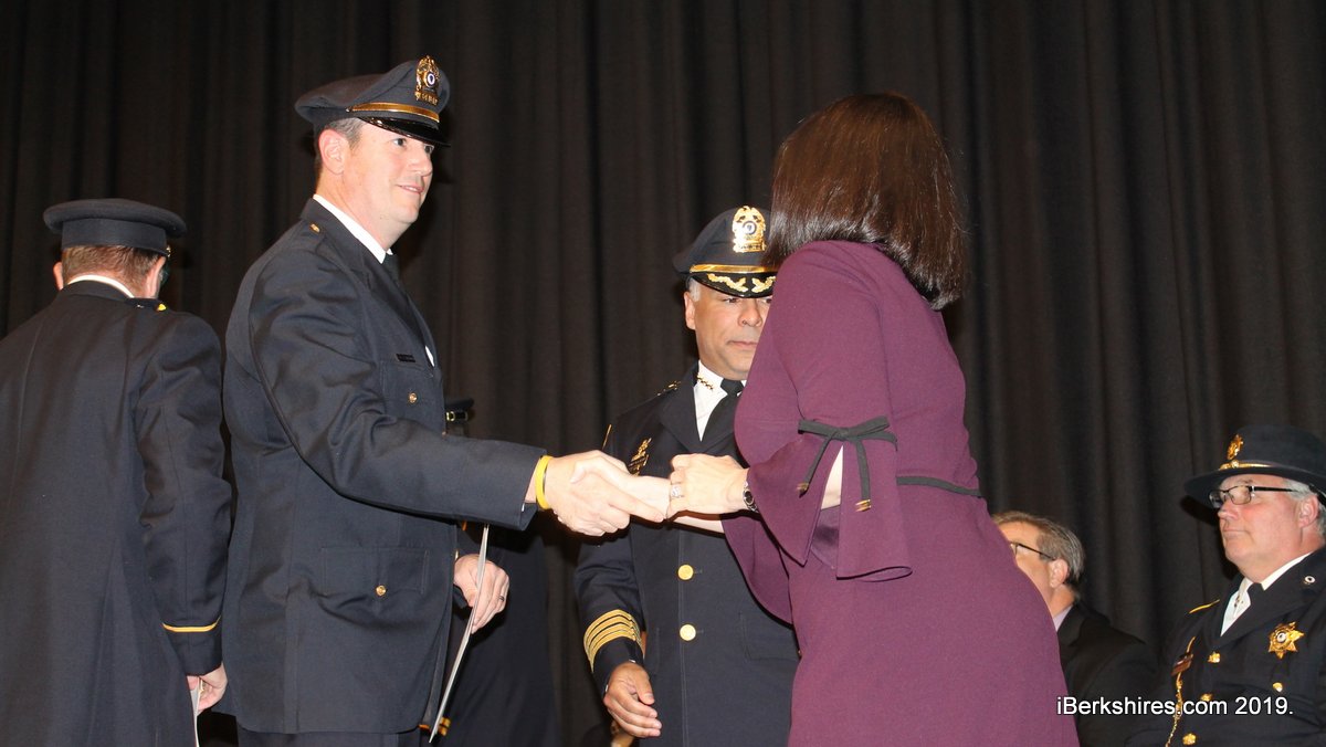 The pinning ceremony honored five who are moving into sergeant positions -- Barbour, Callahan, Kirchner, John Mazzeo, and John Murphy III. Each of those was pinned with their new badges by loved ones on the stage at Taconic High School.