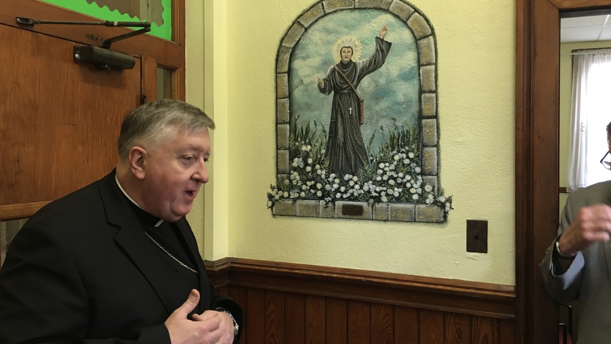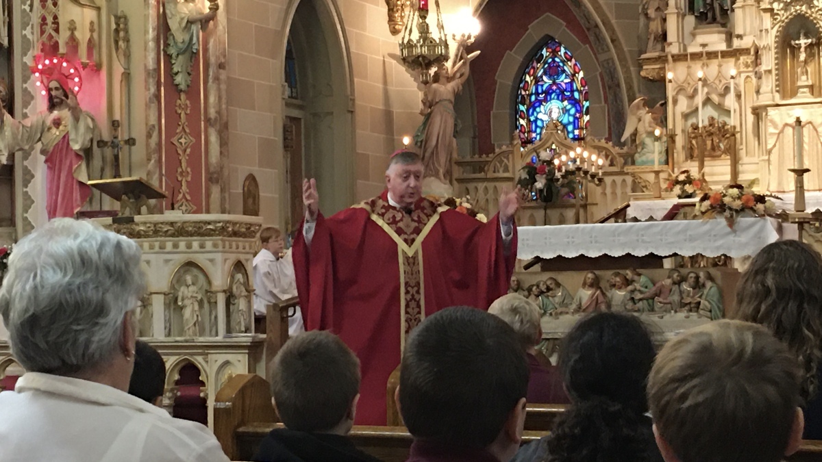 ADAMS, Mass. — Bishop Mitchell T. Rozanski was in Adams on Monday morning to deliver Mass at St. Stanislaus' Church and visit with the students of St. Stanislaus Kostka School.